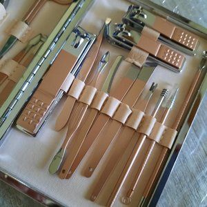 Stylish and functional 18 in 1 Multi-Functional Manicure Set from RIYA. Includes tools for your daily facial care. hand care and foot care in a gorgeous 2-tone stainless steel and matt rose gold finish. Comes in a custom made faux leather durable carrying case.