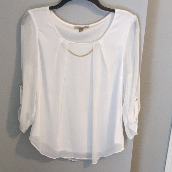 Lightweight chiffon material with layer underneath to covered the see-through material. The sleeves are see-through. The gold necklace is attached to shirt.