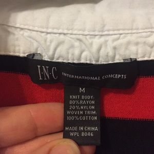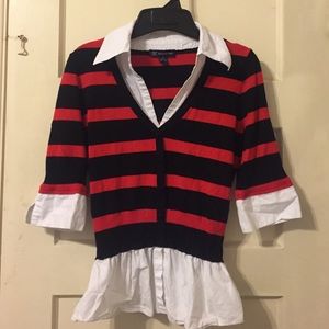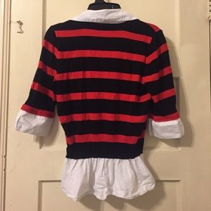 This shirt is so cute! It is one piece white button up collar shirt with black and red sweater over it. But only one layer!!!