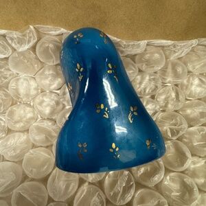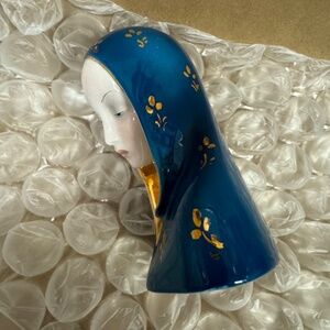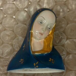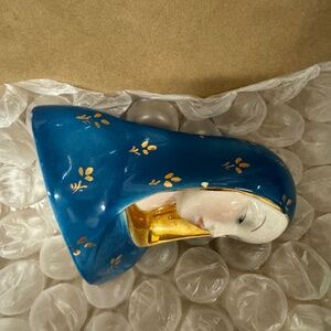 This vintage Eugenio Pattarino Madonna figurine is just gorgeous! Her face is beautiful and I love the contrast of the deep blue of her veil with the bright gold accents. The statue is signed E.P.F 63 Italy on the bottom. Condition is excellent all but one small chip you can see in the photo. The measurements are approximately 5" tall & 4.25" wide & 2.25" deep. International shipping costs will be calculated based on Buyer's location. Buyer is responsible for shipping cost.