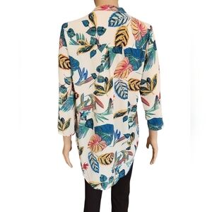 This blouse is in excellent condition - no stains or holes. It's a lightweight fabric with a tropical monstera leaf or banana leaf print - maybe a few birds of paradise!