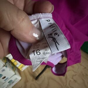 Stylish purple one-shoulder swimsuit with white ruffle detailing. Perfect for a chic beach look.