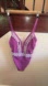 Stylish purple one-piece swimsuit featuring delicate white lace trim. Perfect for a chic beach look.