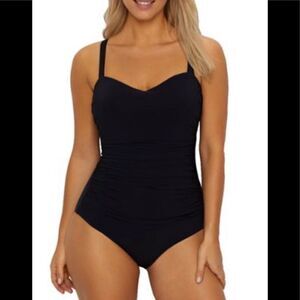 New. Tummy control panel, ruched side, full coverage bottom, adjustable straps, soft formed cups with underwire and bra like construction with closure for great support. I love the black matte finish on this fabric.