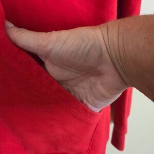 Comfortable and stylish red zip-up hoodie with front pockets, white stripes, and branding. Unique, Rare, Logo, Ideal for casual wear.