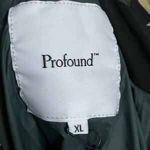 Stylish black puffer jacket with vibrant floral design. Features colorful flowers and 'Profound' branding.