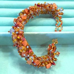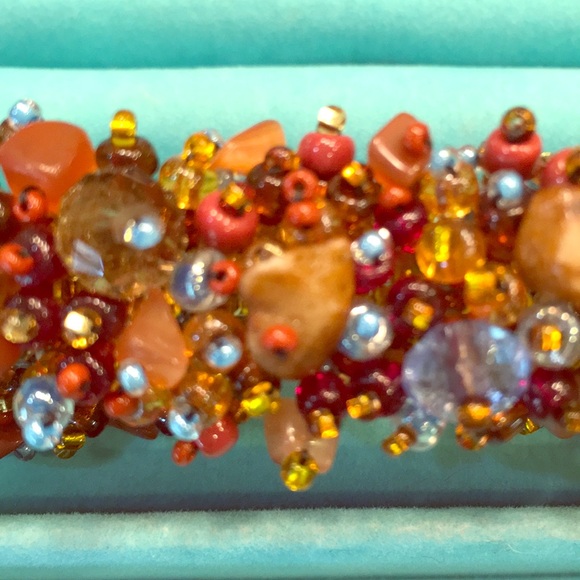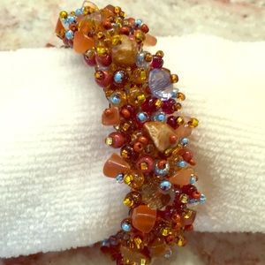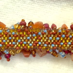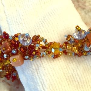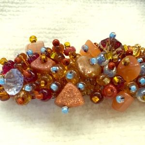 Fabulous amber, goldstone and blue glass beads will burst from your wrist! Two beaded ring closures make it adjustable from 7 to 7.5 inches. Preowned but flawless.