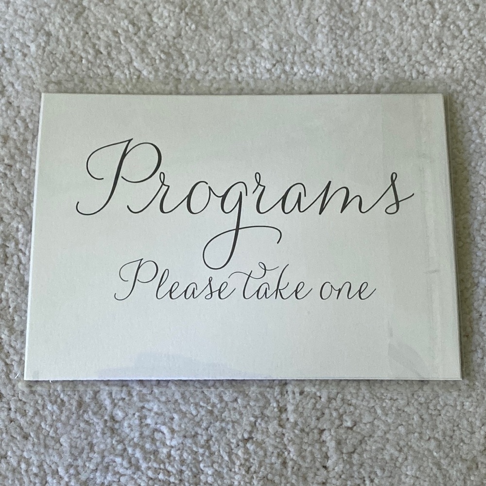 Perfect for your wedding! ‘Programs Please Take One’ sign. Sign has never been used. Put it in a 5x7 frame for your wedding ceremony. Black writing with a Pearl/shimmer background. See video.
