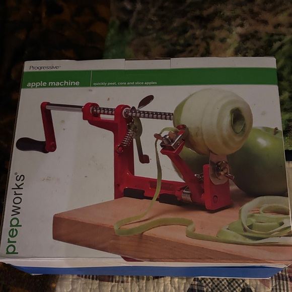 Red apple machine for peeling, coring, and slicing. Easy to use kitchen tool.