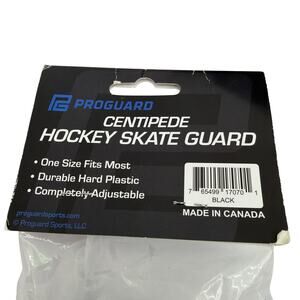 Proguard Centipede hockey skate guards in black, one size fits most. Hard plastic, fully adjustable blade guards designed to protect hockey skate blades during storage and walking off-ice. Item remains sealed in the original retail packaging, which shows some creasing and minor wear at the card and edges. Made in Canada. Includes one pair of skate guards.