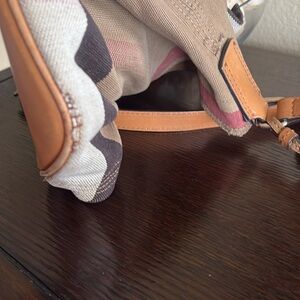 Burberry tan and brown crossbody bag in need of some TLC has small tears towards the bottom of the bag and a stain on the cloth still functional. Please see all photos being sold as is. The Burberry has been authenticated will provide COA.