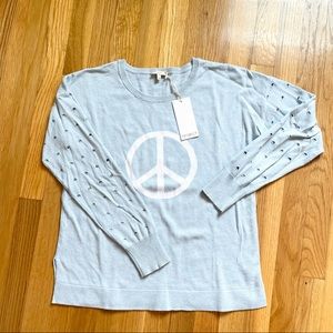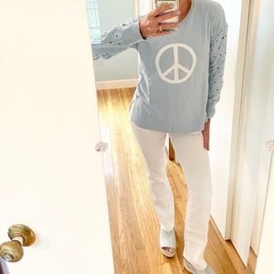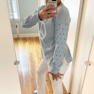 Channel your inner flower child in this fabulous peace sweater from Project! Known for their amazing 100% cotton knit sweaters, Project knows how to mix it up, yet keep it classic! Love the open knit sleeves and baby blue background color that makes the white peace sign pop! Crewneck, side slits along the hem. It’s amazing!! ✌🏻🕊☮️