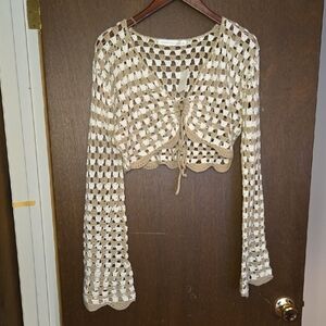 Vibrant yellow lace blouse. Features ruffled sleeves and intricate detailing. Perfect for a stylish look. ptp 19. length 19