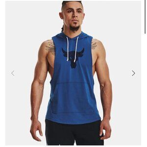 Introducing the Under Armour Project Rock Sleeveless Hoodie in Blue Blood, available in Men's size Small. This pullover style hoodie is perfect for any casual occasion and is designed to showcase your respect for the rock theme. The hoodie comes in a stylish blue color and is made of high-quality material that guarantees comfort and durability.
