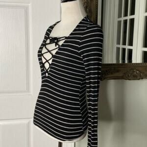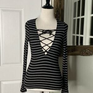 Project Social for Urban Outfitters Striped Lace Up Knit Top Size XS. Black and white top. V neck lace up style. Long sleeve lace up top. Length 22”. Chest across flat 15”. Sexy cleavage striped top