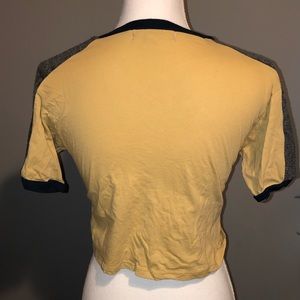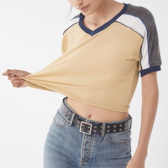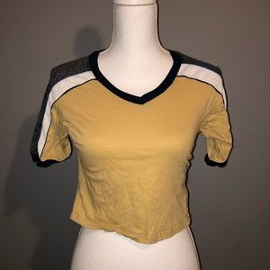 This unique T sold by Urban Outfitters is a must have. Awesome light yellow wash and textured blue, grey and white striped sleeves. The v-neck and crop combo🔥