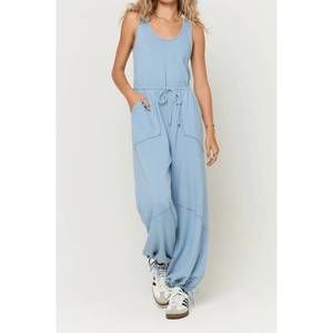 NWT! Comfortable sleeveless jumpsuit with a drawstring waist. Features spacious front pockets. Ideal for casual outings.