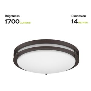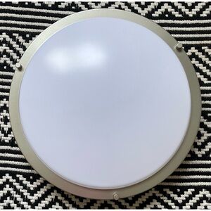 Project Source LED flushmount light in satin nickel finish. Frosted white opal shade to reduce glare. 1700 Lumens. Used for only one week & ended up switching to a different style light. Unable to return, because I discarded the original packaging.