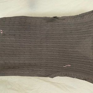 V-neck, grey sweater vest, with pink embroidered detail, distressed hems purchased from Nordsrom