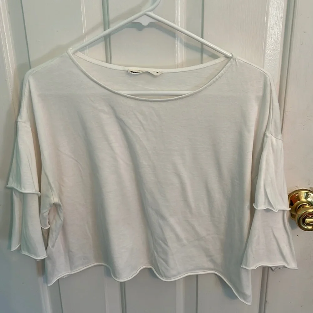 White oversized cropped tee w sleeves.. two tier short sleeve w second tier having a slit.. good condition