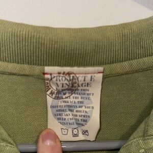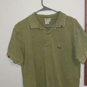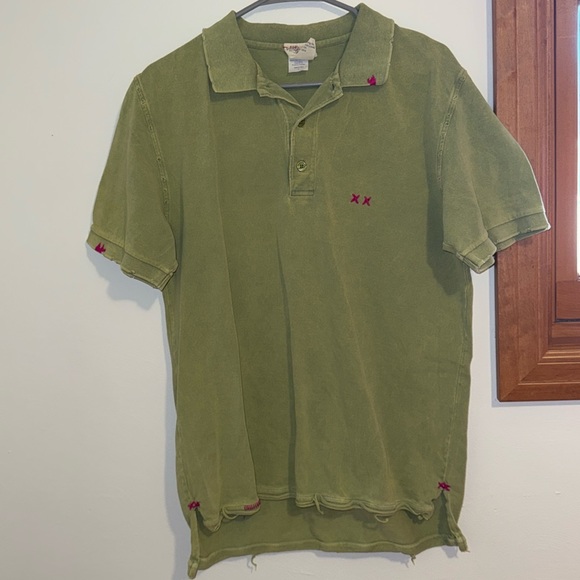 Men’s large. Green color with magenta stitches. The polo looks worn but it came that way it’s “distressed” worn once