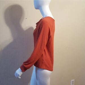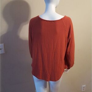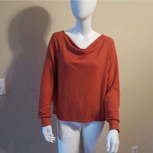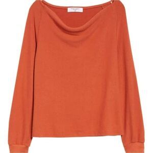 A draped neckline and supersoft hand make this rust-hued pullover as cozy as it is cute. Fits true to size.