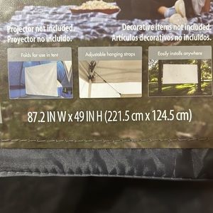 Brand new. Never used. Projector screen. 100 inch movie screen. Attaches to canopy, folds for use inside tents, adjustable hanging straps. Easily installs anywhere.
