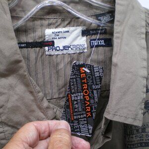 NWT, Projek Raw, Collared, button-down, short sleeve, casual shirt. Tag lists color as Khaki, but looks olive green. Size XXL (looks like it might run on the small side). Front has numerous prints on front in black (see pics) with reddish-orange embroidery on the left side by the pocket. Buttoned breast pockets on both sides. Left sleeve has small pocket on it. Right sleeve has PJ emblem. Back is stitched down the entire back in the middle. 100% cotton, machine wash and dry. Check out my other listings for more great shirts - bundle and save! I like offers.
