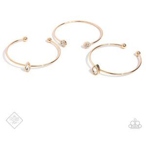 Set in the center of sleek, skinny gold bars, a white marquise-cut gem set in a gold frame and a faceted white teardrop set in a textured gold frame glisten atop the wrist. Dainty white rhinestones set in a scalloped frame bloom around a duo of white gems, framing the opening of a third, dainty, gold bangle-like bracelet. Each bangle features gold beads affixed to its ends, reminiscent of barbell fittings for a charming, stackable finish.