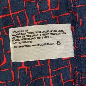Prologue women’s short-sleeve shirt dress, size Medium. Navy blue with bold red geometric pattern, collared neckline, front button closure, and pockets. 100% polyester. Modern and relaxed fit—perfect for office or casual wear.