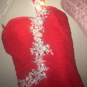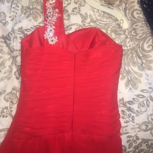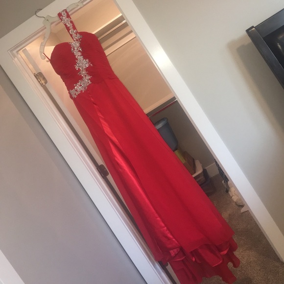 Originally purchased from a prom girl type website, this dress has only been worn a couple times and is in perfect condition. It has been dry cleaned. It has a long silky train in the back. There are no tags on this dress but I'm almost 90% sure it's a size 2. This dress is padded around the breast area so no need for a bra. Perfect for high school formals and proms, pageants, or black tie events. This dress is sure to wow the crowd!
