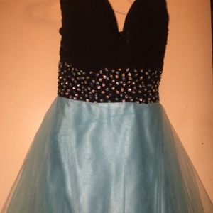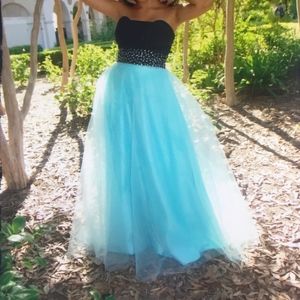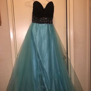 This beautiful strapless turquoise dress is perfect for the prom, or your sweet 16. I've only worn it once and it was used. for my sweet 16 party, it is so comfy and yet so elegant and the color is just really pretty. The size is a 4-6, but definitely more of a true 4 and does have a bit in bra and strap as you see in the picture. If you have any further questions feel free to ask me about either more details on the dress or a negotiable offer.