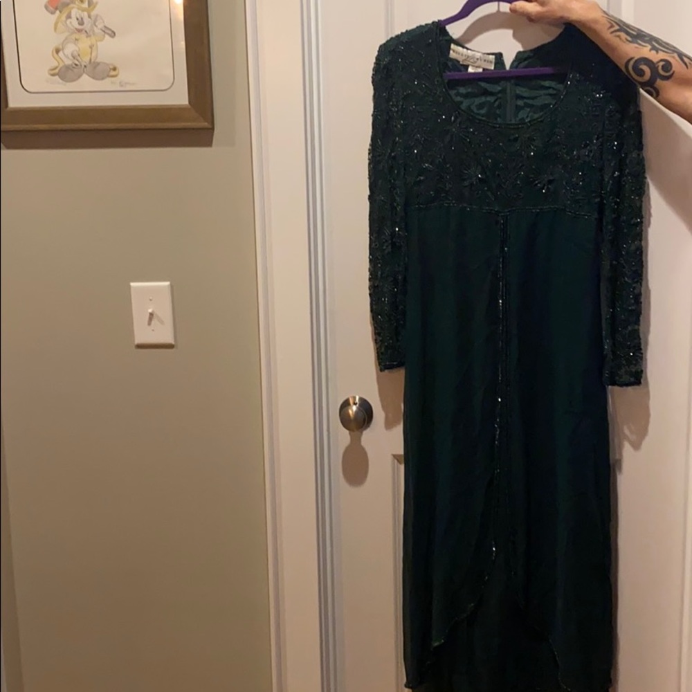 It is a full length green dress with a flowing skirt and sequined top in a size medium
