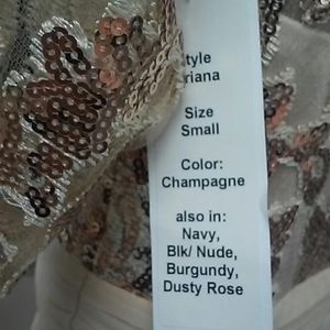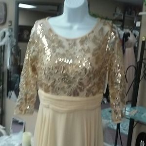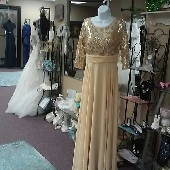 Champagne chiffon gown with sequin bodice and 3/4 sleeves