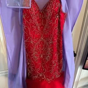 Step into the enchantment of the night with our breathtaking red mermaid-style Vienna prom dress. This exquisite gown is a symphony of elegance and allure, designed to make you the star of the evening. The form-fitting silhouette gracefully hugs your curves, accentuating your figure with its sleek lines and tapered waist. Crafted from luxurious red satin, the dress exudes a regal charm, while the mermaid tail adds a touch of whimsical fantasy. The Intricate beading and sequins cascade down the bodice, glistening like stars against the rich red backdrop. As you glide across the dance floor, the flowing mermaid skirt gracefully trails behind you, ensuring all eyes are on you. This red mermaid-style Vienna prom dress is not just an outfit; it's a statement, a celebration of your unique beauty and undeniable sophistication. Also just worn one evening.