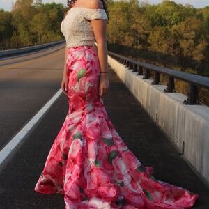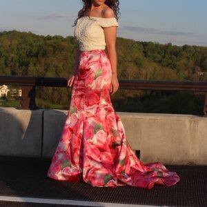 2 piece prom dress with a pearl top and floral bottom that has a small train. only worn twice. Size 4 from sherri hill