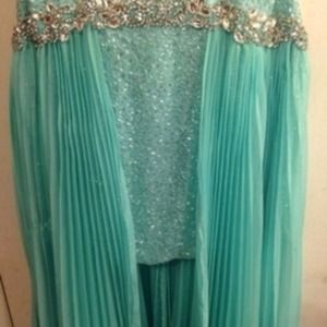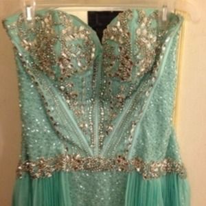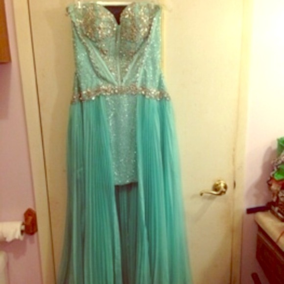 Size 12 high low light blue with silver jewels/sequins. Strapless sweetheart top. Only worn once, it's in mint condition. (willing to negotiate price)