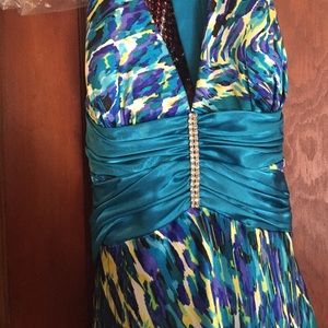 Satin full length prom dress. Teal with yellow, white, periwinkle, and black design. GORGEOUS open back with slight train. Slightly altered, cups sewn into chest, train is clipped to hang like pictured. In GREAT condition! Worn only once. Absolutely NO damage!
