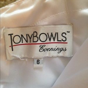 Only worn once Tony Bowls size 6 prom dress. White fabric with turquoise, lavender, and black detailing, plus side panels that open to a funky pattern. Lots of fun to spin in! There's a train that include a hook bustle for dancing plus built in bra support. The fabric is a little stretched from the tape I used to help keep my girls in but it's on the inside so no one can see it.