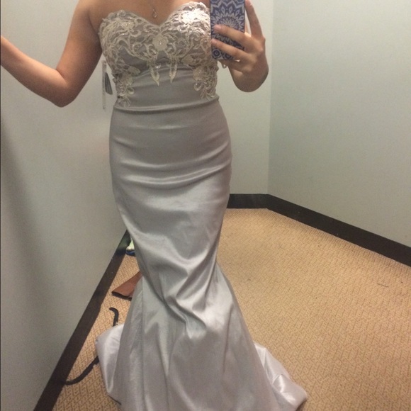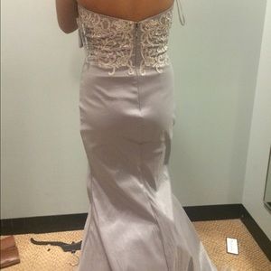 Silver gray dress, worn once, pearly white beading With small gemstones on it. It was only worn once and it was also altered. I'm 5'0 but I wore 5 inch heels with it.