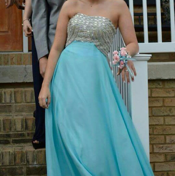 Worn once, no defects. Light blue dress with silver beaded bust. Size 8, but corset back makes it size adjustable.