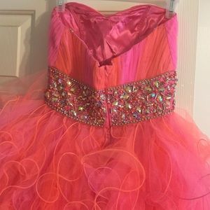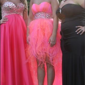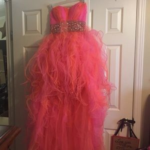 This Dress is a size 0 it is high in the front and a lower in the back If you have any questions please text me 318-426-3480 I will be glad to try and answer them