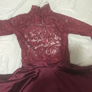 Short , Burgundy , Back Left Out , Collar . Wore Once ! Gold Detail On The Collar and Bottom (back) Of The Skirt .