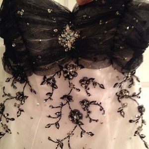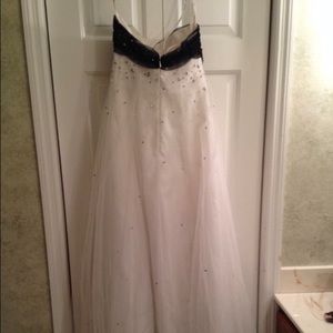 Morgan and Co. Very pretty, strapless dress with hidden zipper. Black beading on top, very comfortable, no alterations.