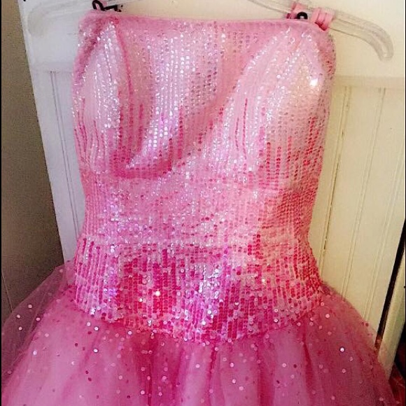 Girls I am cleaning out my closet and I am finally wanting to part ways with this beautiful prom dress, it is a size 16 it is also strapless with a corset back... As you can see it is a light pink that changes into a darker pink, It's in mid condition.