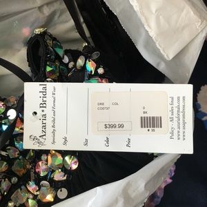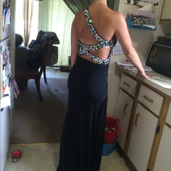 Black prom dress with a slit in the front and beading. Dress is open back. Never worn and still has tags