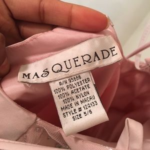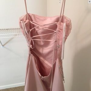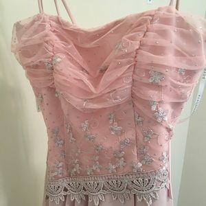 Light pink with detail work on front and open back. Worn once. Comes with a shawl. Needs to be dry cleaned.