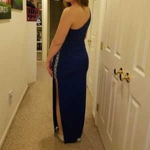 Royel blue prom dress only worn once. There is one or two lose rhinestones on the side of the dress, there is also sight pilling of the fabric in areas. It's actually a size Larry but I am an 8/10 and fit into it well.