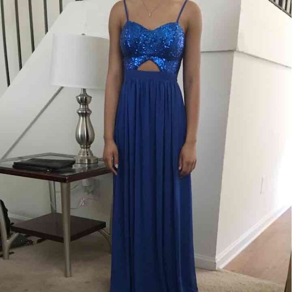 Royal Blue, sequined top, flowy bottom, slightly exposed mid drift, thin adjustable shoulder straps, zip up back, size 1/2, unused, 10/10 condition