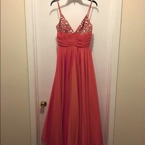 Worn only for prom night for a few hours! Great condition! Coral colored dress with rhinestones on the chest. Size 4. I'm 5'2" and weigh 125 just to give you an idea of the size a little more.